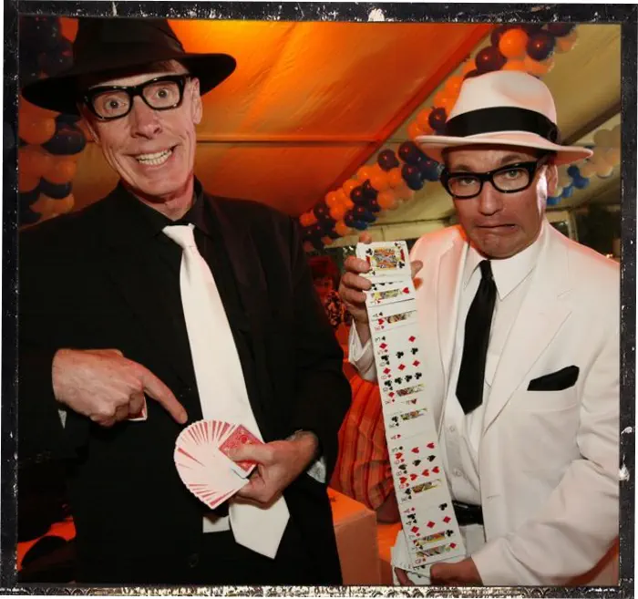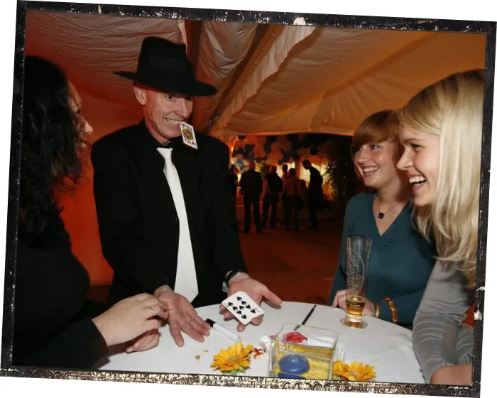 Die Hütchenspieler klären auf...Zuerst: Wir spielen FÜR Geld, niemals UM Geld!Die Fingerfertigkeiten und Griffabfolgen klassischer Straßen-Hütchenspieler (Betrüger) werden ergänzt durch Elemente der Close-up Zauberei und interaktiv mit viel Humor vorgeführt.Die Mitspieler spielen um von uns (oder dem Veranstalter) zur Verfügung gestellte “Einsätze”, wie z.B. verpackte Pralinen, Zigarren, Gutscheine, Give-Aways, Visitenkarten, Streuartikel, Spielgeld oder selbst gestaltete “Firmendollar”. Nie um gültige Zahlungsmittel!Denn: Straßen-Hütchenspiel ist organisierter Betrug!Show-Hütchenspiel aber ein großer Unterhaltungsspaß!Mehr Information über die Hamburger Trick- und Hütchenspieler finden Sie auf der eigenen Webseite der ehrlichen Betrüger:www.Trickspieler.deWelchen hätten Sie denn gern?Die Hamburger Trick- u. Hütchenspieler schlüpfen in verschiedene Kostüme & Charaktere!Ob Hehler, Mafioso, Lude oder Gentlemen…Wählen Sie die Type, die am Besten zu Ihrer Veranstaltung passt. Das Hütchenspiel können sie alle...